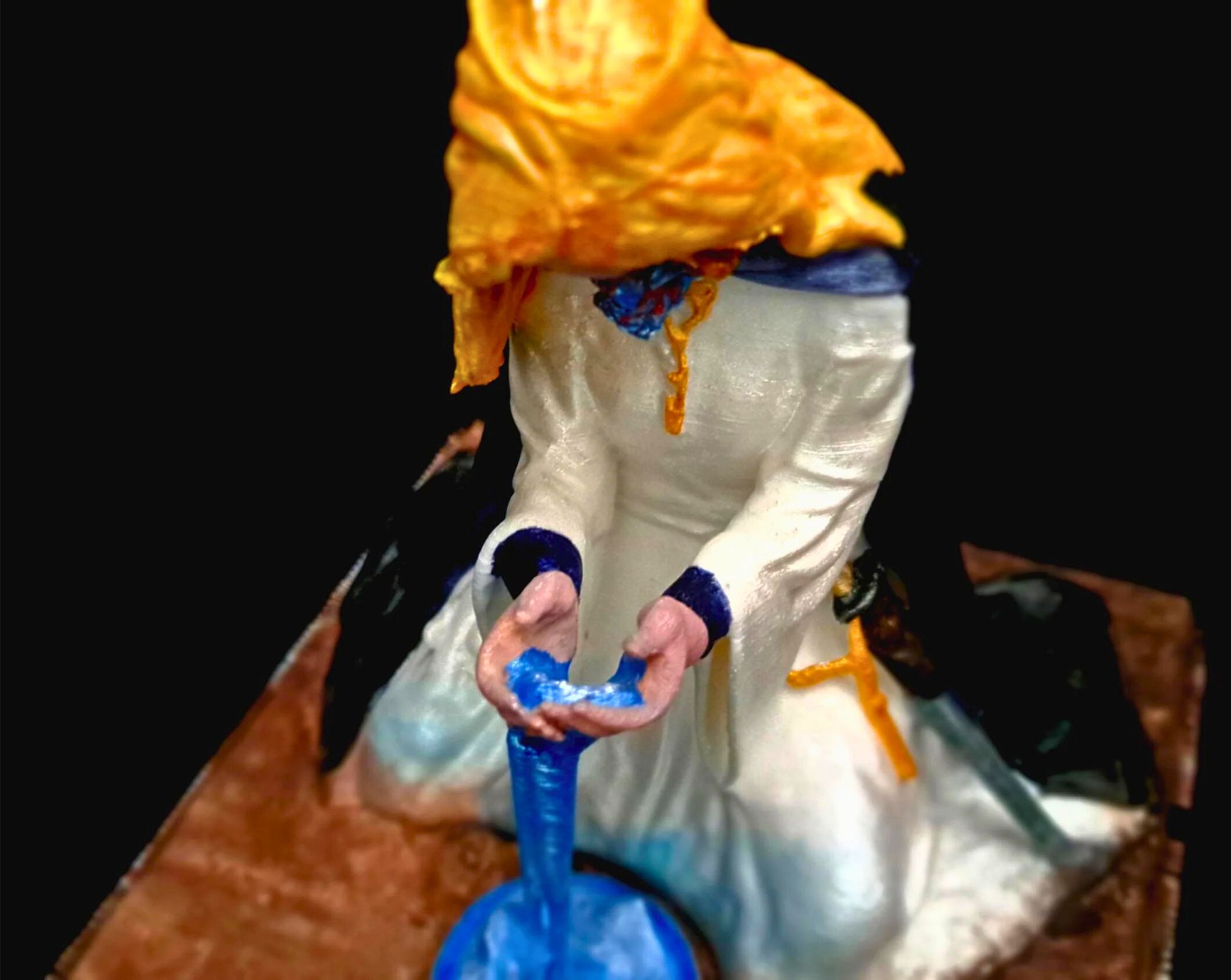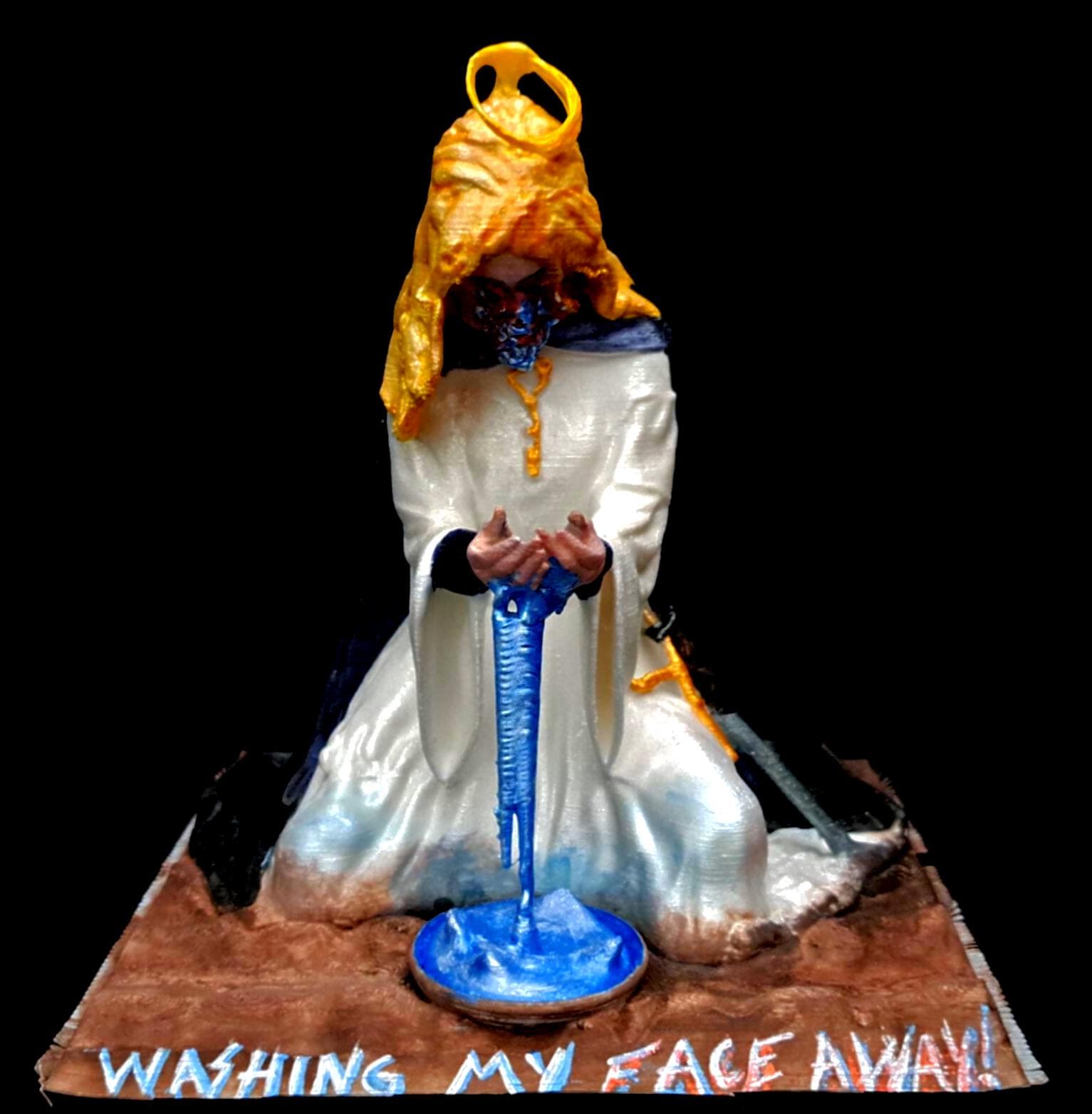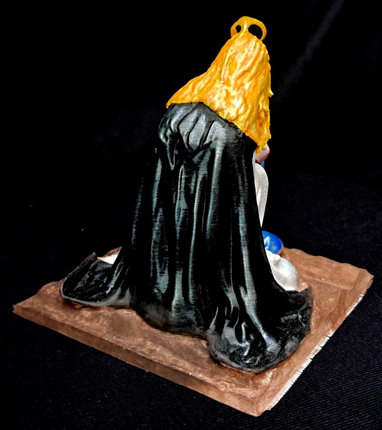 Each *Sister Celeste* sculpture is an **original creation** by the artist, starting with **digital modeling** in Meshmixer, refined and printed in **high-quality PLA filament**. The model is **hand-assembled, re-sculpted**, and detailed with sculpting pastes and modeling compounds. The surface is **primed and hand-painted** with multiple layers of **acrylic paints** to achieve a luminous, ethereal finish that captures the divine transformation.