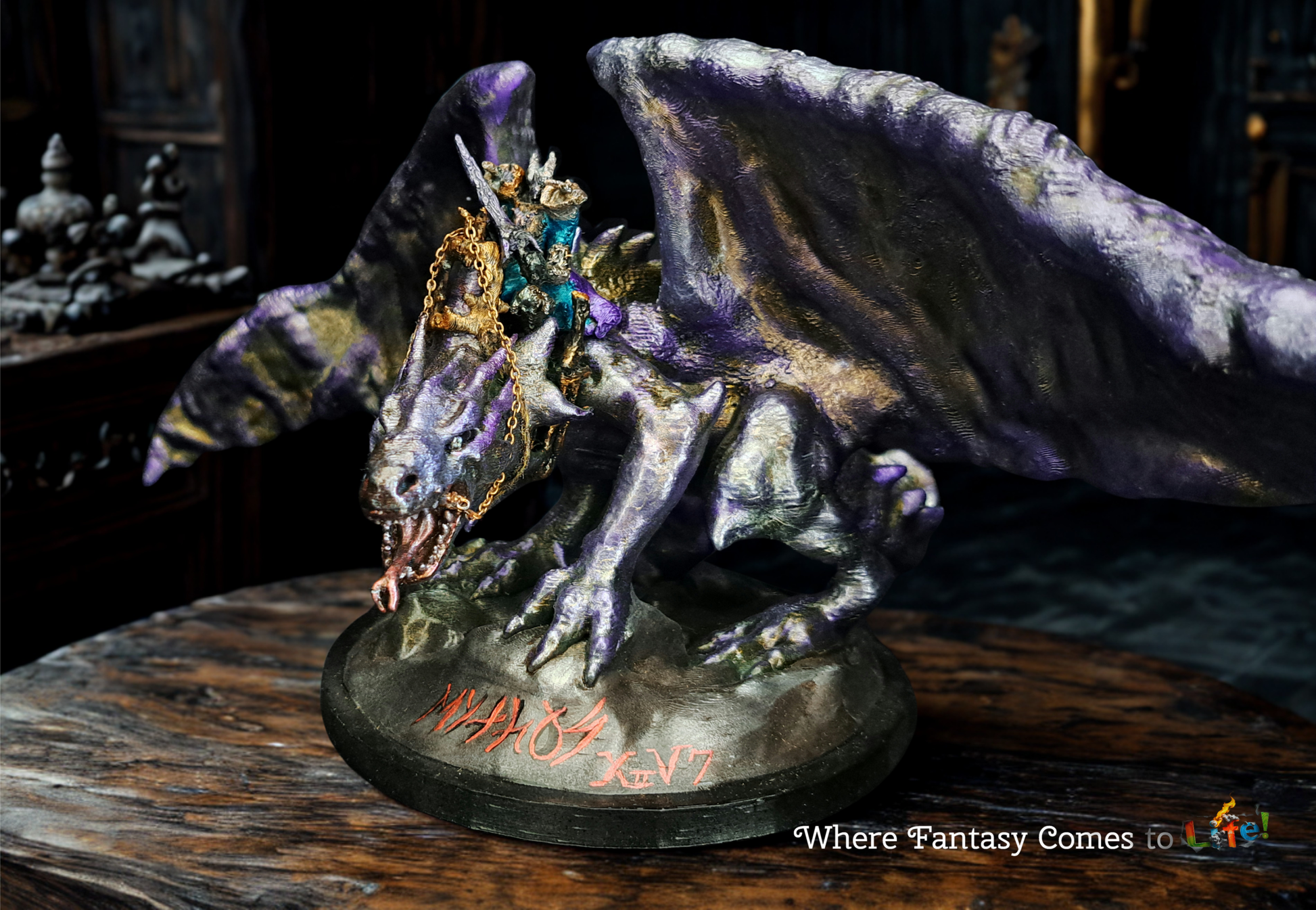 The diorama features Thyralax, a magnificent dragon whose wingspan extends over 400 mm, sculpted in lifelike detail to reflect both the power and weariness accumulated over centuries of flight. His scales shimmer under subtle hand-painted tones, conveying the weight of time and the majesty of his final act. Thyralax is paired with his devoted Dragon Rider, who can be posed either astride the saddle atop Thyralax’s back or seated on the weathered stone beneath the dragon’s gaze, each position symbolizing loyalty, sacrifice, and a bittersweet goodbye.