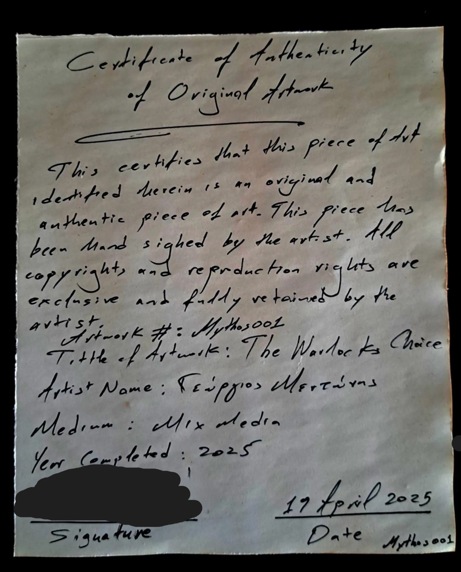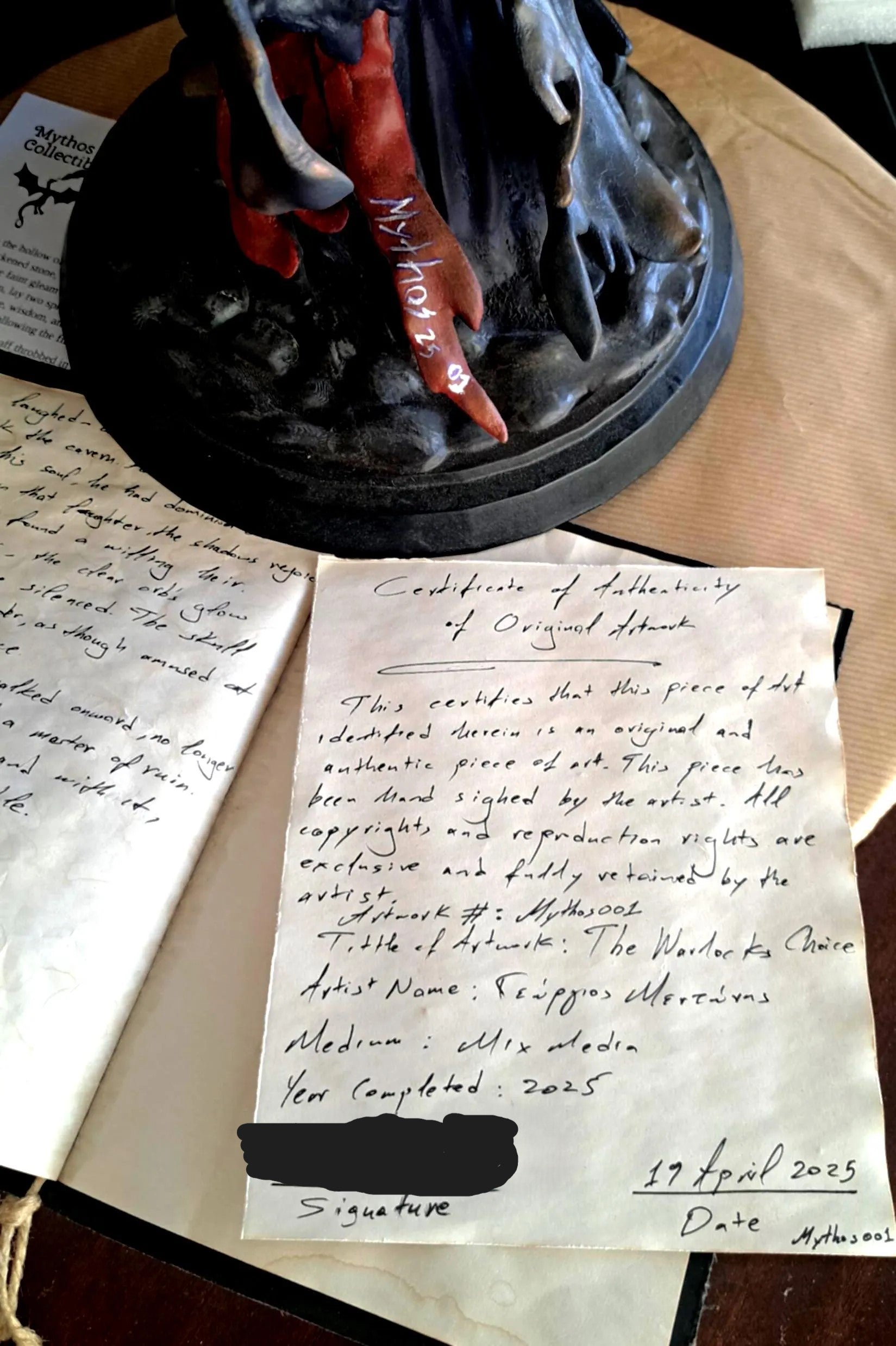 Each Warlock’s Choice sculpture is originally designed, 3D printed, and hand-finished by the artist. The process begins with custom modeling in Meshmixer, refined in 3D printing Software, and printed in premium PLA filament. Every component is then assembled, sculpted, sanded, primed, and hand-painted using acrylics and mixed media to achieve its distinctive tone and mood. The final piece is sealed with a protective coat and signed with the Mythos Collectibles mark and unique numbering.